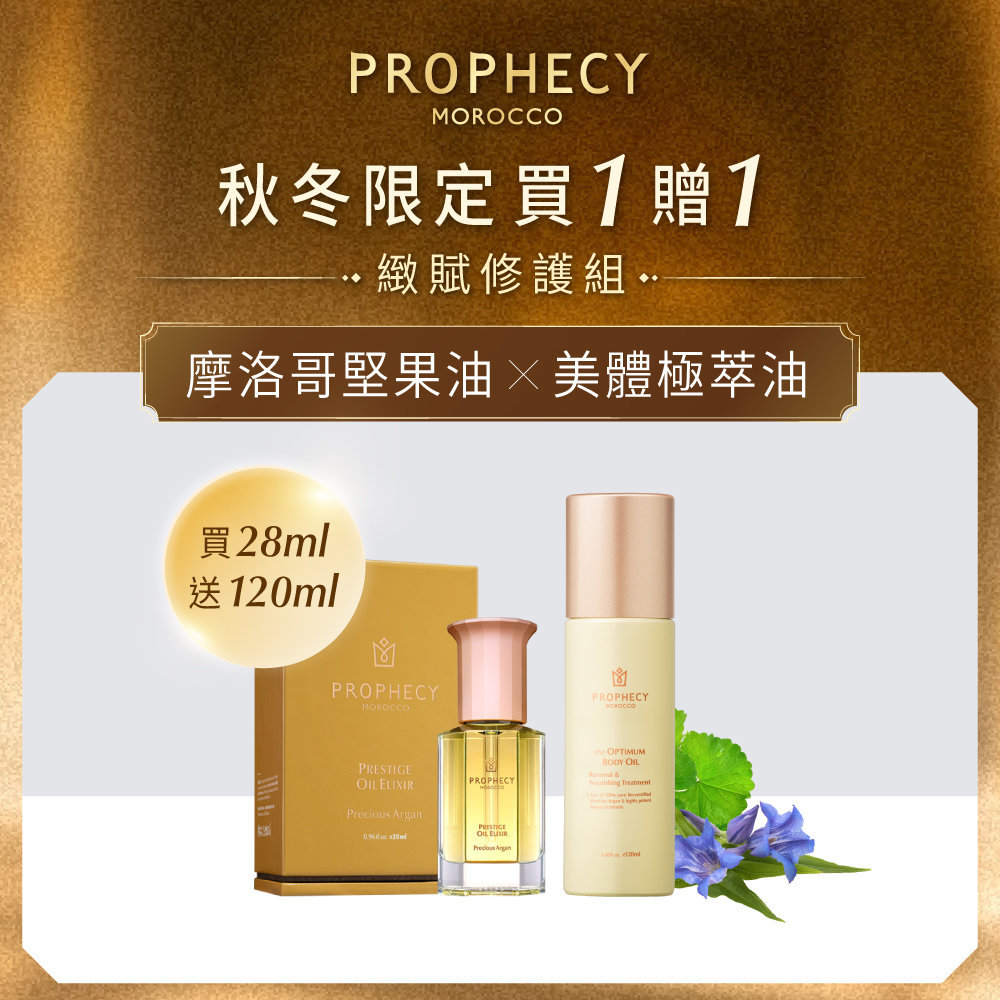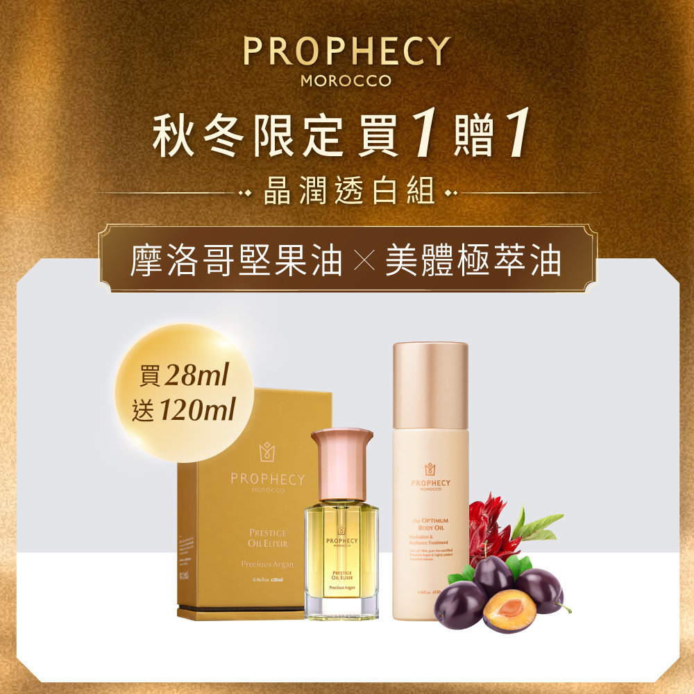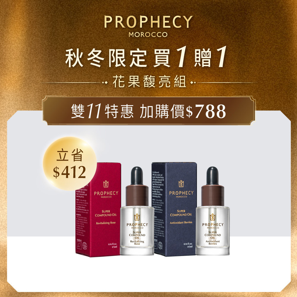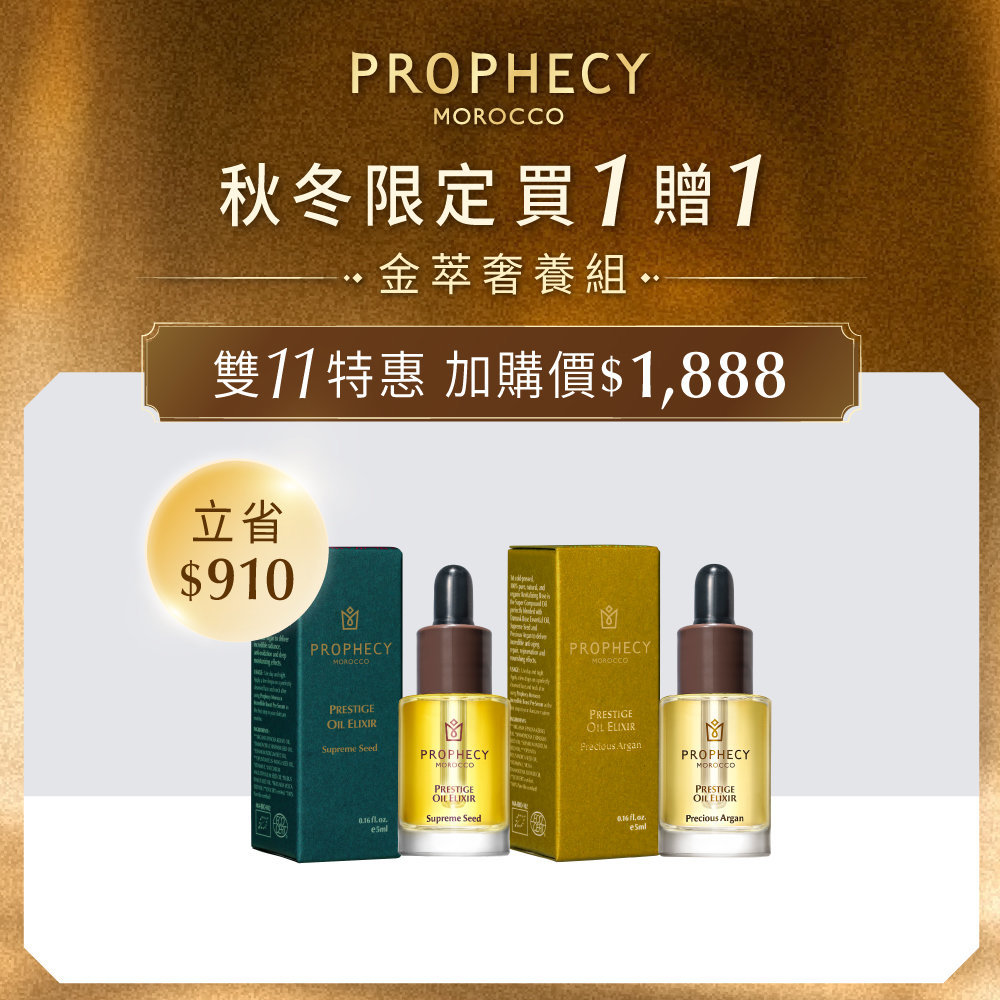 迎接雙11購物季,西班牙頂級油保養品牌 鉑翡斯 Prophecy Morocco 深深了解肌膚乾荒的困擾,推出雙11限定優惠——11/8-11/24 下單購買摩洛哥堅果賦活金萃油28ml,就送價值$2,190 的美體極萃油120ml;全館單品結帳現折$211,任選3件再享88折,單筆任購滿$6,000直升白金VIP,再贈保濕的超能前導精華露 鎖水亮澤120ml。同時,全館消費不限金額還可加購初緻淨膚、金萃奢養和花果馥亮三款限量套組,從潔顏到以油養膚,輕鬆打造完整冬季保養體驗。這個冬季,就用鉑翡斯的超人氣潤澤天后—摩洛哥堅果賦活金萃油,養出潤澤肌膚,從臉到全身都感受柔嫩光滑。