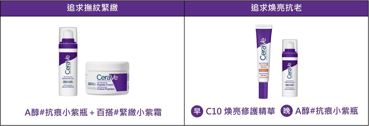 抗老不是盲擦越多成分或是越強越刺激越好,而是要知道肌膚最缺的是什麼。CeraVe 適樂膚這次把抗老+修護做成一套貼近消費者抗老保養真實需求的完整解方,稱它為NO.1抗老霸主完全不過譽!無論你是敏感肌、成分控或是想用 A 醇的新手都能安心使用。什麼?你說你已經在找代購資訊了嗎?現在適樂膚紫色系列已經上架蝦皮商城和 momo 品牌旗艦館啦!現正限時優惠中!這系列搶貨級抗老神物,你還不立刻入手!