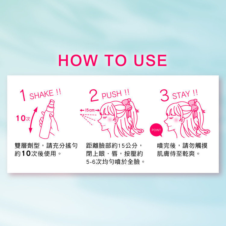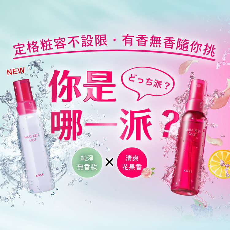 ● 完粧後只需輕輕噴灑細緻水霧,在悶熱的環境下也不會脫粧的定粧噴霧化粧水!在意香味的人也能使用的無香料款限量登場!