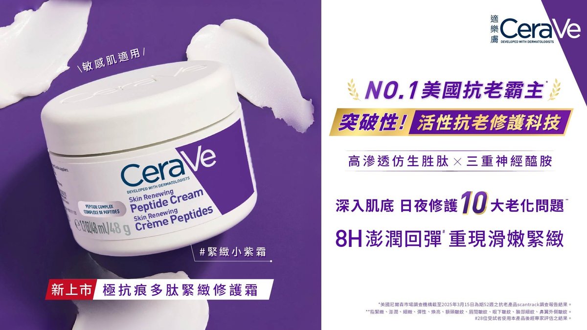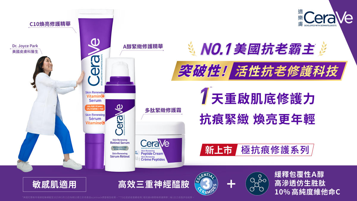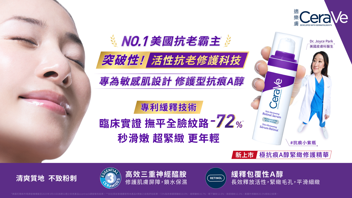 據統計,台灣護膚保養產品市場於2024年7月至2025年6月總產值達新台幣623億元,其中訴求抗老功效保養產品占整體臉部保養市場總值達45%並持續呈現成長趨勢。綜觀近年保養品市場發展,各類新穎抗老成分、高濃度配方與主打速效抗老產品快速推陳出新,消費者關注度最高的成分熱搜關鍵字包括A醇、胜肽、菸鹼醯胺、神經醯胺、外泌體及維他命C/E等。隨著成分選擇日趨多元,錯誤使用方式、頻繁更換產品或過度疊加高刺激性、高濃度成分的保養行為亦隨之增加,臨床上反而常見肌膚泛紅、敏感不適等問題,使抗老保養不僅未能改善老化,甚至產生抗老「負作用」,讓原有肌膚老化問題更加複雜棘手。為了協助台灣消費者在追求高效抗老的同時,降低肌膚不適與刺激風險,No.1美國抗老霸主* - CeraVe適樂膚,2026年正式在台上市橫掃美國銷售突破16億、修護型抗老保養的全新生力軍『極抗痕修護系列』包含三大最強肌膚抗老冠軍新品【1】NO.1美國抗老A醇*|極抗痕A醇緊緻修護精華#抗痕小紫瓶:專為敏感肌設計,首創修護型抗痕A醇,結合獨家專利緩釋包覆性A醇與高效三重神經醯胺,同步啟動屏障修護與高效抗老雙重機制,省去傳統A醇的耐受陣痛期,全面撫平全臉紋路達-72%**,成為A醇無痛抗老的安心首選。【2】NO.1美國抗老乳霜*|極抗痕多肽緊緻修護霜#緊緻小紫霜:被譽為萬元貴婦乳霜最強平替修護型乳霜,添加高滲透仿生胜肽與三重神經醯胺,日夜修護10大老化問題***、澎潤回彈****,重現肌膚滑嫩緊緻的最佳狀態。【3】NO.1美國維他命C精華*|極抗痕C10煥亮修護精華#擦的綜合維他命:獨家專利結合高效三重神經醯胺與10%高純度維他命C、維他命B5與E,如同「擦的綜合維他命」,擊退光老化,終結暗沉問題,使肌膚煥亮提升達70%^。『適樂膚極抗痕修護系列』以品牌核心屏障修護科研-高效三重神經醯胺為基礎,依據不同抗老需求,精準搭配全新突破的活性抗老修護科技(緩釋包覆性A醇/高滲透仿生胜肽/10%高純度維他命C),實現1天重啟肌底修護力#,達到抗痕緊緻、煥亮更年輕的全方位抗老效果,為台灣消費者提供兼顧安全性的抗老保養新選擇。